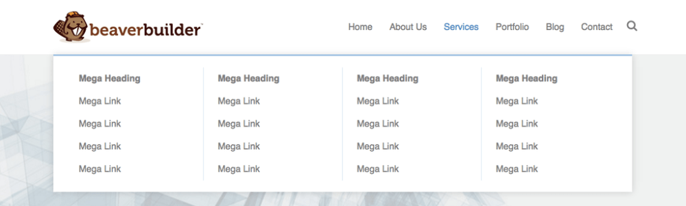 You can turn standard drop-down menus into mega menus in the Beaver Builder Theme, as shown in this screenshot.