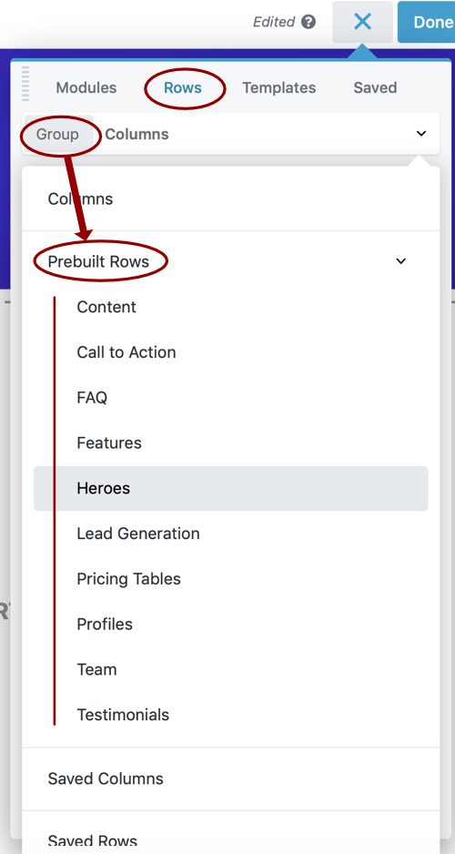 - Add one or more prebuilt row layouts and modify them. Click the Rows tab, in the Group field select Prebuilt rows, then choose a category and drag your selection into the layout. See this article on prebuilt rows.