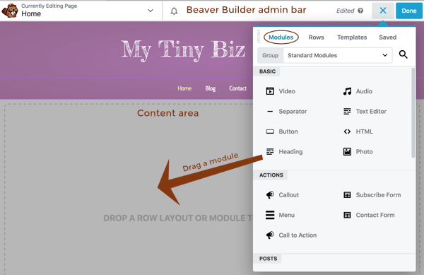 - Design your content from scratch by dragging individual modules into the content area. Click the Modules tab and drag a module into the layout.