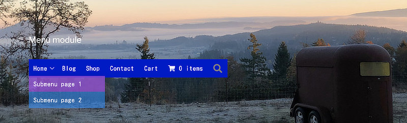 The following screenshot shows a vertical layout with a color background in the same column. The menu's boundary is sized to fill the column width and the submenu and search icons are right-justified. You can adjust the width of the module by changing the column width or adding margins or padding to the containing row or column, or increase the margin of the Menu module itself.