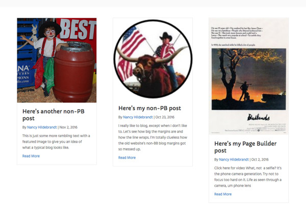 The following screenshot shows a list of Beaver Builder and non-Beaver Builder posts in a Posts module with a Columns layout.