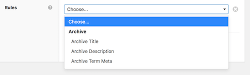 In Archive-type layouts, you can set conditions based on the archive properties of title, description, or meta, as shown in the following screenshot.