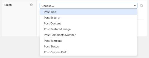 You can set rules for various aspects of posts, archives, authors, users, and ACF custom fields. The items you choose for the rule determine which comparison operators are available. For example, Post title, Post excerpt, Post featured image have some or all of the following comparison operators: