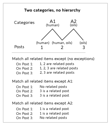If you specify one category as an exception, such as Match all related categories except oils, any post assigned to oils is discarded as a related post, even if it's also assigned to human.