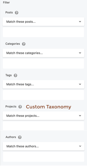 The Match all related [items] except option is available with any of the settings listed in the Filter section: post types, categories, tags, authors, and custom taxonomies. The list of settings you see can change with the post type you select.